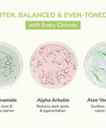 A daily balancing face wash with Niacinamide, Alpha Arbutin, and gentle coconut-based cleansers. It helps remove dirt, control excess oil and visibly even out skin tone, gently and effectively. Non-stripping and leaves skin feeling clean, soft & comfortably balanced.